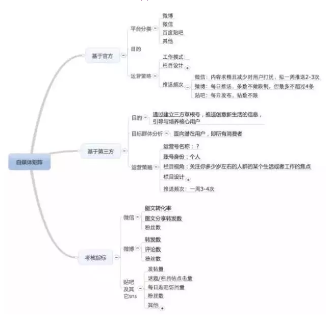 這張思維導(dǎo)圖是讓你腦海中有一個(gè)新媒體矩陣,了解作為一名新媒體運(yùn)營,除了運(yùn)營好自己官方的帳號,和第三方大號的合作也非常重要,所謂借力打力,最后你要了解你的考核指標(biāo),組建一個(gè)這樣的思維矩陣后,既可以清楚知道工作方向,又可以打破現(xiàn)有的思維格局。